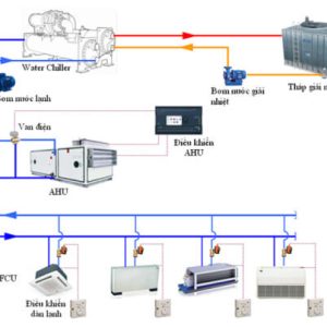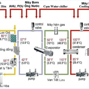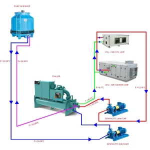 - Bơm nước lạnh từ Chiller đến các dàn lạnh (AHU, FCU), sau đó quay lại Chiller để tiếp tục chu trình.